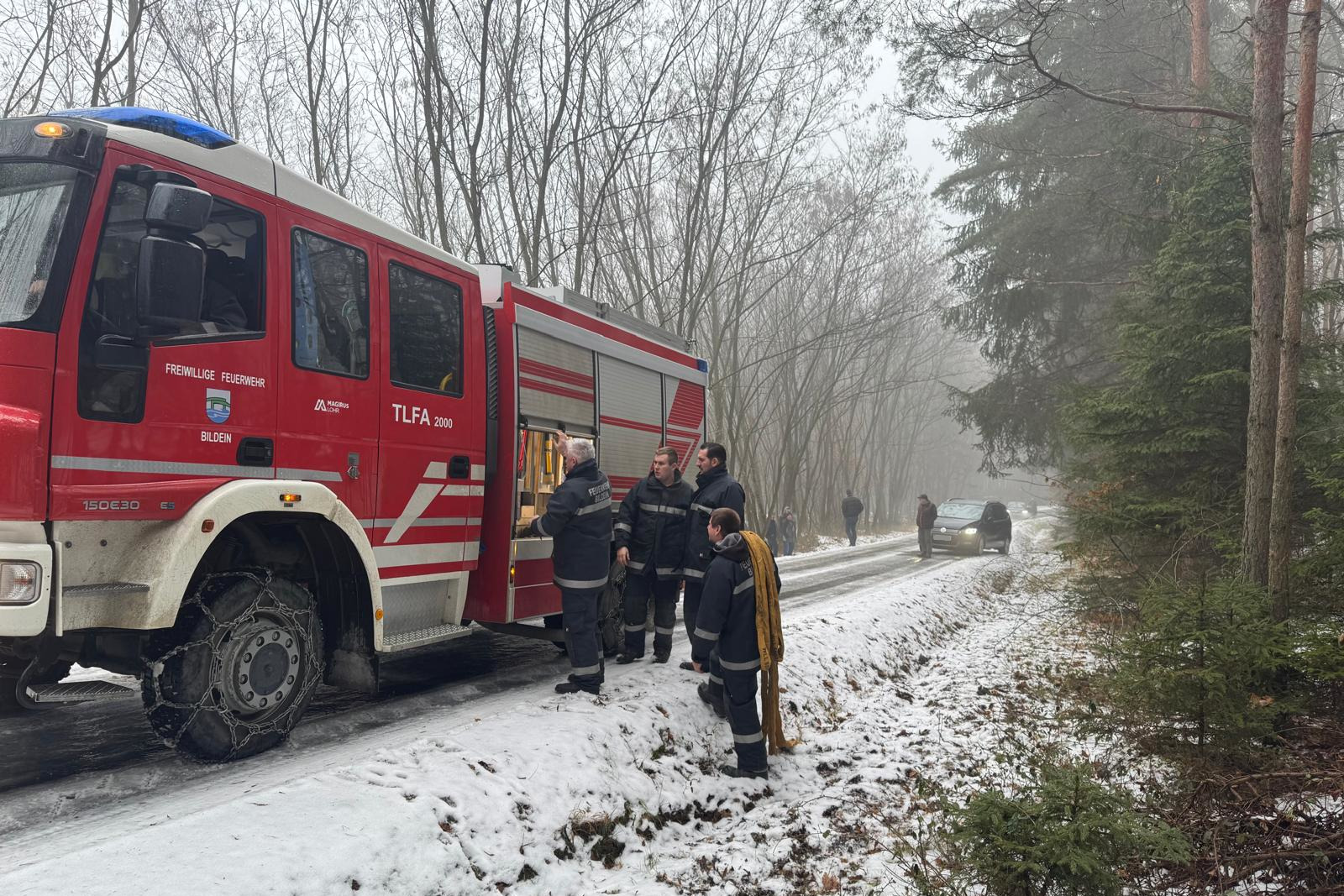 Zu unserem zweiten Einsatz am 25. Jänner 2026 wurden wir am späten Vormittag telefonisch um Hilfe gebeten. Ein PKW war auf einem spiegelglatten, ansteigenden Güterweg hängen geblieben und rutschte in Richtung des Grabens.
