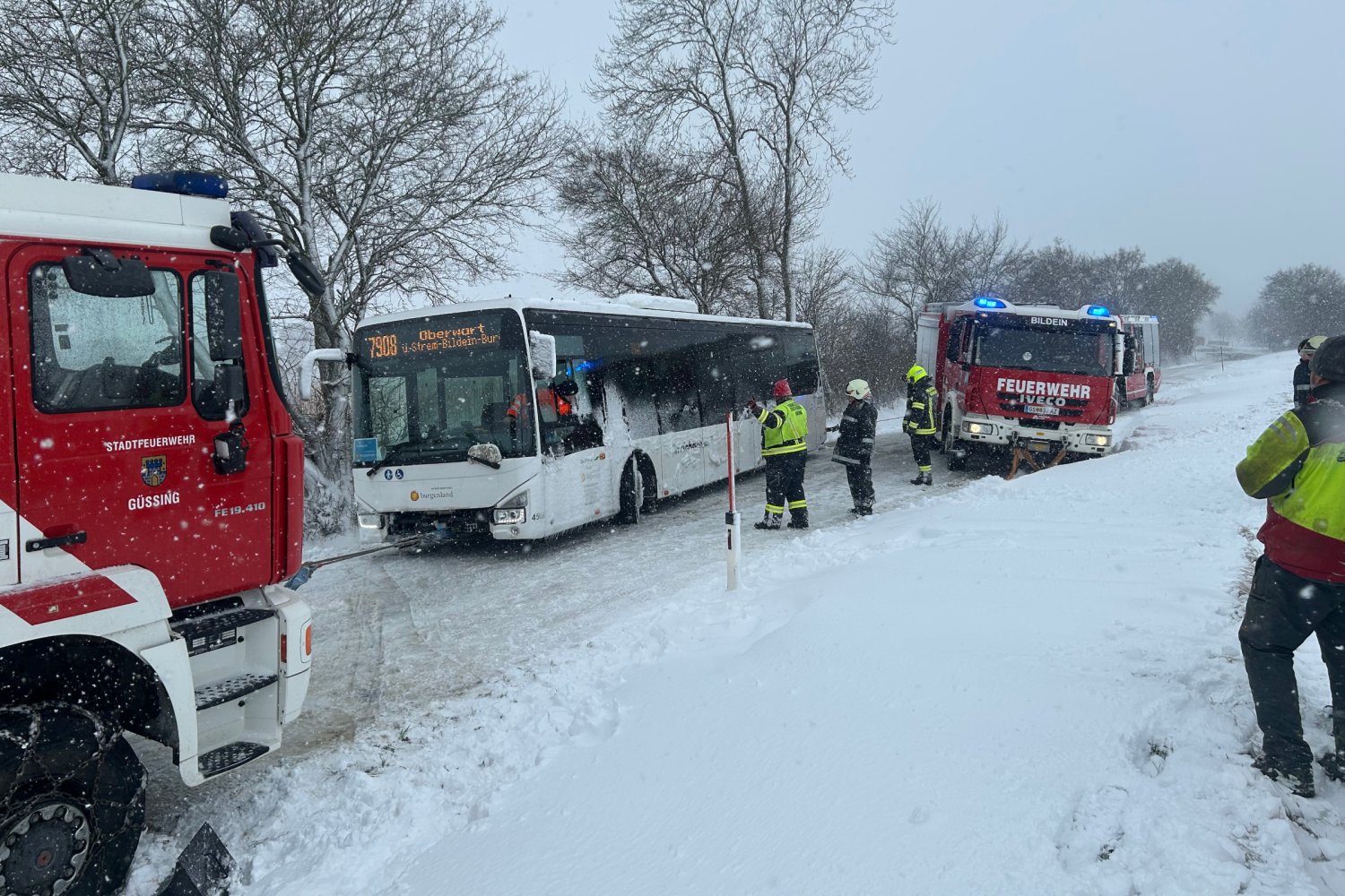 Nachdem Eberau und Bildein auf dem schmalen Straßenstück weitere Unterstützung brauchten wurde die Feuerwehr Güssing nachalarmiert. Mit dem Einsatz von zwei Seilwinden und einer Umlenkrolle und einem weitern Fahrzeug als Anschlagpunkt wurde der Bus vor dem Abrutschen und Umkippen gesichert und gleichzeitig aus dem Graben gezogen.